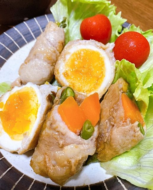 豚ロース肉でゆで玉子とか野菜を巻いてボリュームアップした肉巻きを作りました。
