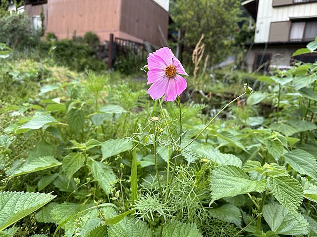 で、葉っぱばかりを眼にしたあと畑の見回りをしていたら、うちの有機ゴミ捨て場のあたりになんだかピンクの見慣れない花が一輪咲いていました。どうみてもコスモス。スマホの「植物を調べる」とパソコンに落として Google LENS で調べたら、両者の結果は同一。オオハルシャギク(大春車菊)。とか言っても、やっぱりいわゆるコスモスだよねぇ~ それにしても早生のものとは言え、まだ6月入ったばっかりなのに、もう咲くの~? ありゃりゃ~
