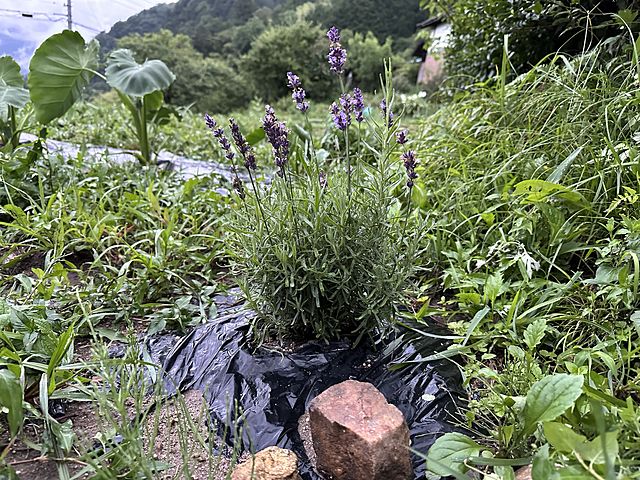 ウラ日記と連動になっちゃってますが、今日の露地植えラベンダーの姿、後ろに里芋くんも写っていますね。ビニールマルチを敷いたところは生育が早く、もうこんなに大きくなっています。