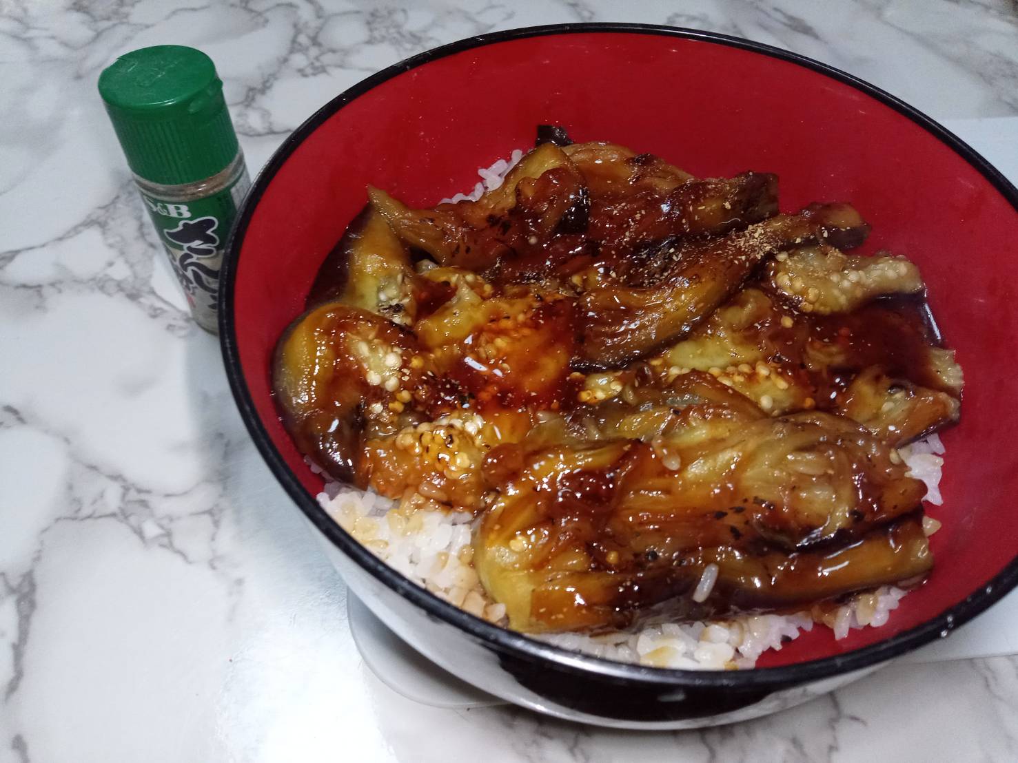 ナスですがかば焼き丼にしたら おいしいよぉ