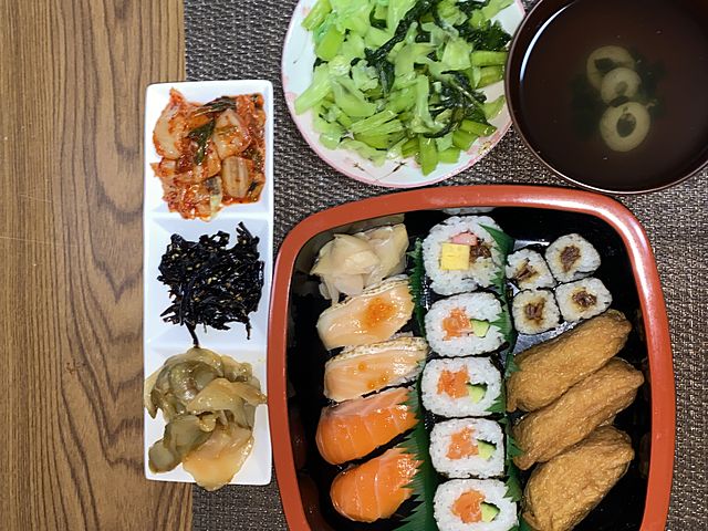 晩めし、半額で買った、300円サ-モン三味.おいなりさん、出前の器にうつしてアレンジしてみました、見た目も味のうち召上がれ。