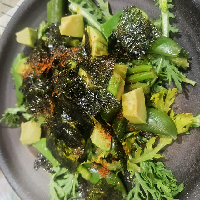 写真は夜ご飯の一部、春菊スナップエンドウアボガド韓国サラダを作りました