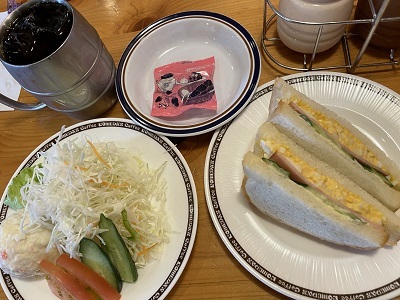 コメダのミニサンド、ミニサラダ、アイスコーヒー。