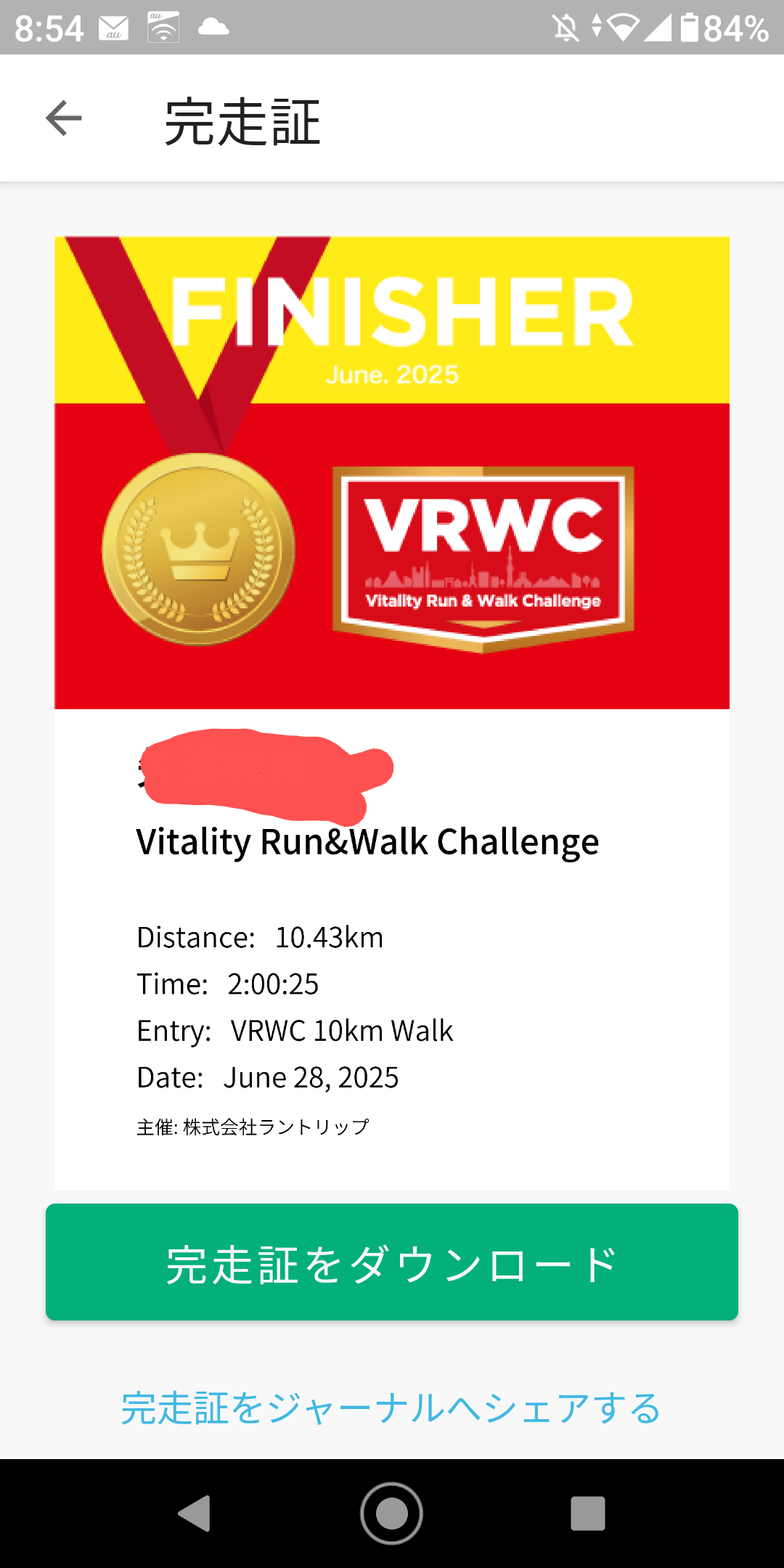 毎月末のオンラインウォーキングイベントの10㎞部門達成。