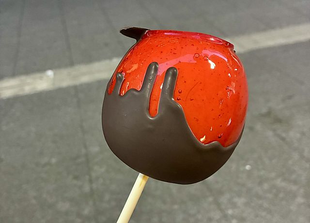 めちゃ美味しそう!最近のリンゴ飴って、重力を無視したチョコのかかり方をしてるのですね!たべたい