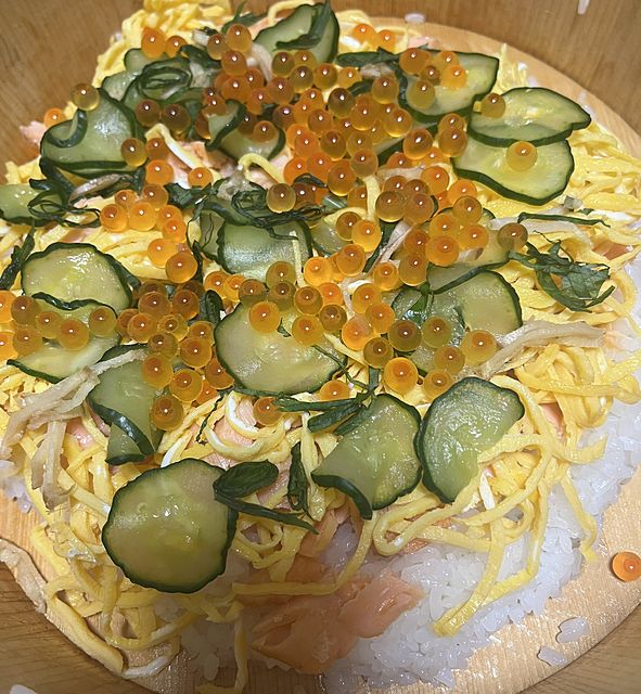 美味しそう! まさか 三杯酢(すし酢)も自分でも調合したんですか? イクラを散らしているのかな? 親子散らしですね!