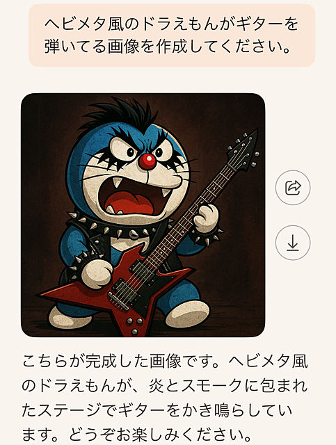 主に仕事で。 先日、NoteBookLMというGoogle系のAIツールで、会社の就業規則を読み込んだら、音声付きガイドのスライドを自動生成してくれた。 新入社員が入ってきたら、これを見せようかな? あと、ポッドキャスト風に男女が会話をしながら就業規則を説明してくれる音声まで生成できて、AIってやっぱり凄いな!って感じている。 画像は、「ヘビメタ風のドラえもんがギターを弾いてる画像」をAIに作らせてみました。 ドラえもん、指あるやん(笑)