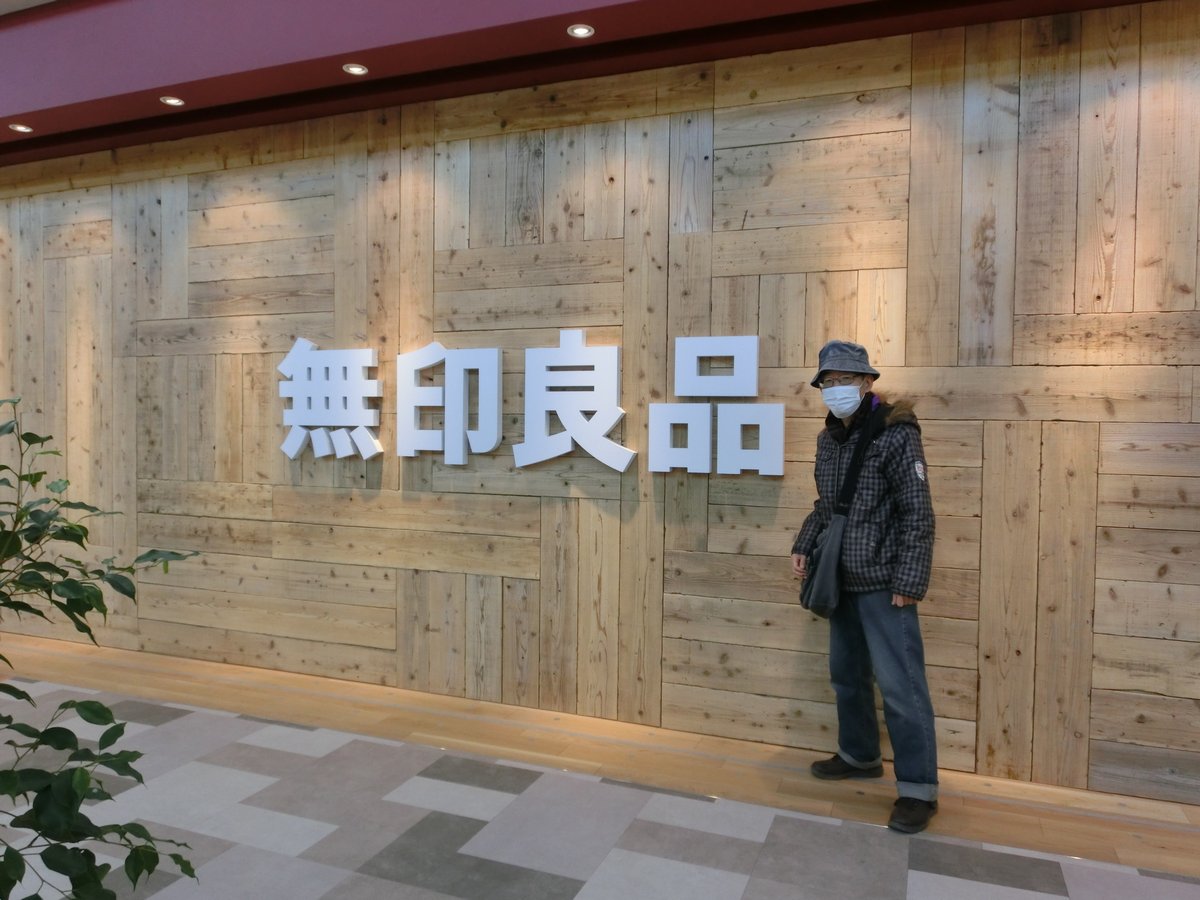 さて 問題です! 私は どこで 買い物をしてきたでしょうか? 答えは、 無印良品の前にあるウエルシア。