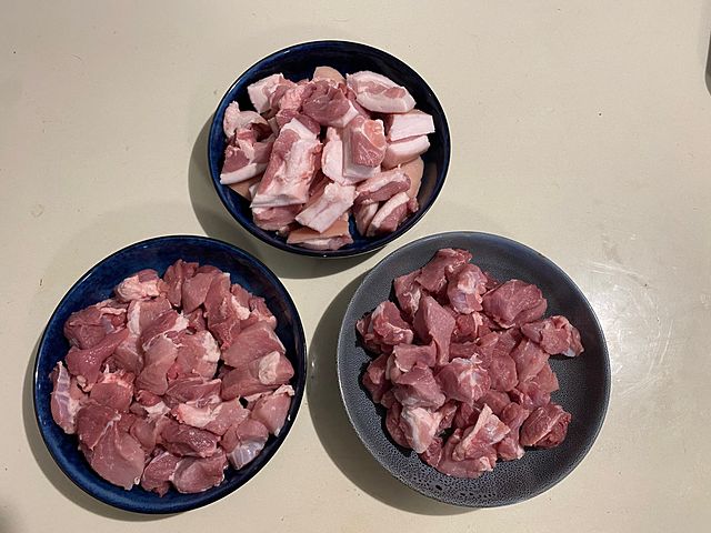 そんなもんで、画像のように3等分したわ。皿1つ分は皮と脂肪部位。これは塩コショウして、200℃のオーブンで約1時間カッリカリになるまで焼く。それでも余るので、残りは、豚の角煮なんかにしてしまう。脂身はフライパンで焼いてもブヨブヨ感が残って、ちょっと気持ち悪くなることが多いので、しっかり煮込み料理にしたほうがいいんだよね。
