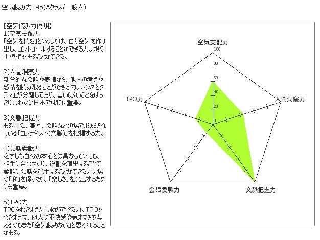 脳内メーカー 武将テスト などなどに続き 見つけちゃいました~♪ 空気読み力テスト~ どれだけ空気が読めるのかどうか! さあ、挑戦! 画像の通り、微妙な結果でした・・・(ーー;) もっと空気読めると思ってたのにな~ 自分では・・・ ちょっとショック~(T_T) 皆さんもお試しあれ~♪ ヽ(^。^)ノ http://www5.big.or.jp/~seraph/zero/ky.cgi