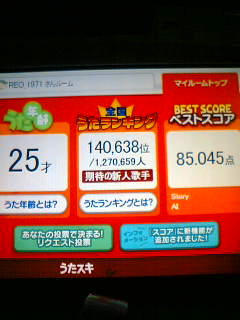 なんか、ウラに普通のログを書くってなんかちょっと変な感じですね(^_^;)。 今日は午前中はテニス。 午後は卓球をする予定でした。 けど、今朝は雨が降っていたからテニスは中止。 午後は体育館に行ったら友達がいなくて連絡してみたら、仕事で今日は中止だってさ。 だったらもっと早く連絡くれればいいのに、せっかく準備して出掛けてきたのに… って感じでダラダラして今日も終わってしましました。 あぁ、それから今日の画像は 昨日僕が歌った歌の点数です。 こんなに取れるとは思わなかったからちょっと嬉しいなぁ~♪(@^▽^@)