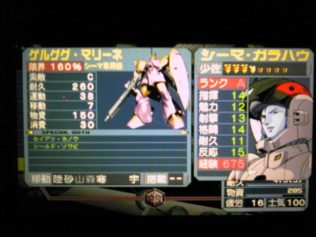 まあ、ゲルググマリーネが1部隊3機編成なので、よく1~2機落とされては居ますが、部隊全滅しない限り問題無し。まあ補充でかなり資金持って行かれるのがきついんですがー