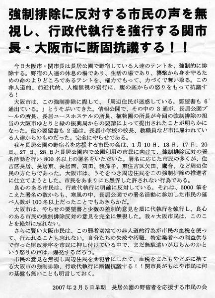 >自立支援の充実をすべき時期なのに強制撤去するのは強権的」と反対声明を出していた。