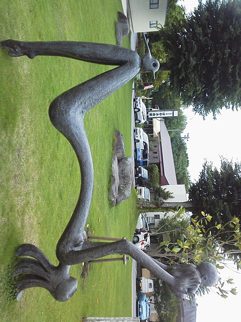 お母さんが 変な体制で赤ちゃん たかい たかい? している。 膝に鳥がのっている。