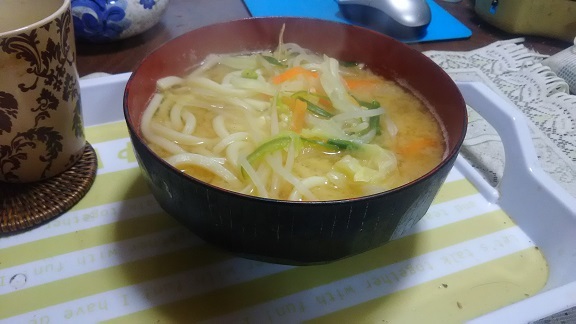 今回は鰹節もいりこも買ってないからダシもとれない。仕方ない・・・最初に香りずけでエンリギを少々煮込んだあと野菜を入れて再度じっくり煮込む。アクをとり、うどんと玉子を1つ入れてからもう1度煮たつまで5分。で、火をとめてから味噌を加えてこれでいいや!って感じ。