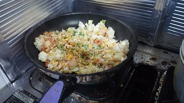 自分、毎朝会社には手製弁当持参なんだ。炊き込みごはんとかチャーハンとかが多いんだけど、これは今朝のチャーハン。香りずけにエンリギは必ず入れる。赤いものはソーセージか人参か、それは朝の雰囲気。グリーンピースを少量いれてから・・最後にわけぎを散らすってのが平均的。