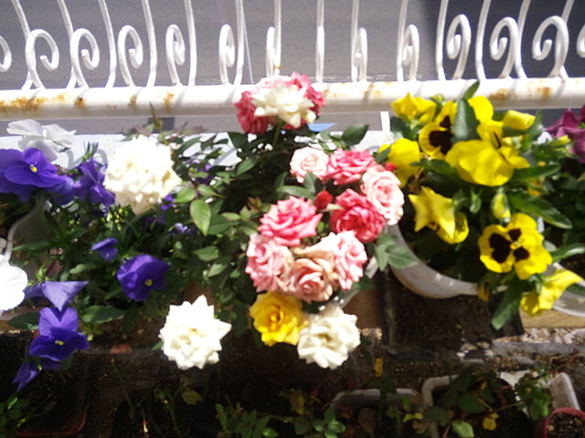 パンジーとミニ薔薇が咲いてます