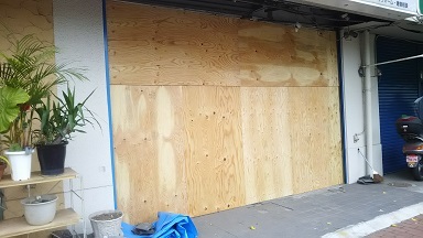 今はこんな感じで内装屋のコンパネ補修で事務所を閉めてある状態。当社の電話も