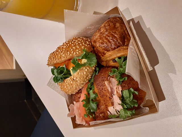 サンドの中はハムやスモークサーモンで、大きさはマックのバーガーの半分位