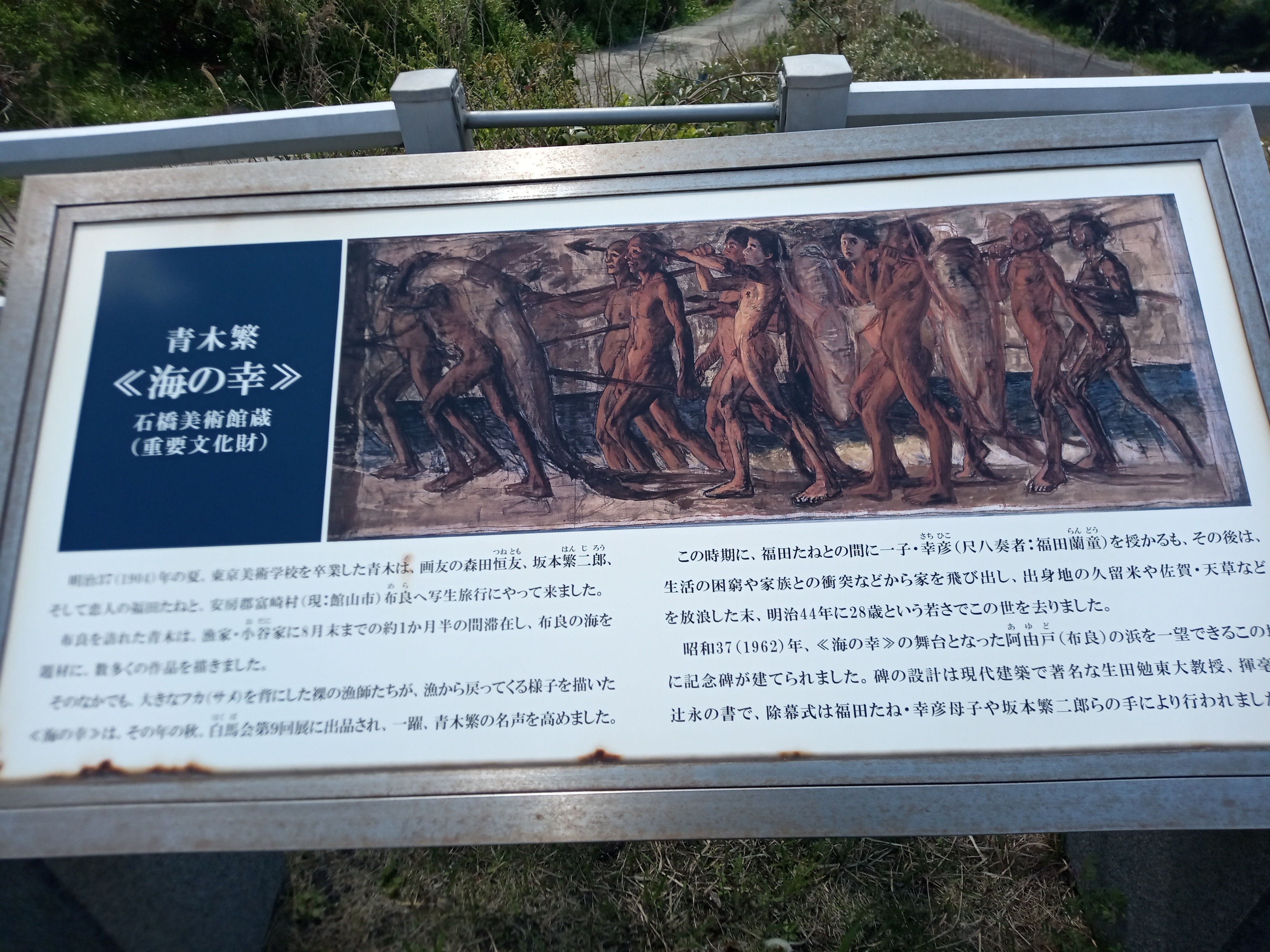 東京美術学校を卒業したばかりの青木繁(22歳)は同郷久留米出身で美術学校の同級生の二人坂本繁二郎(後、洋画で文化勲章受章)と青木に布良を紹介し詳しく話してくれた森田恒友(10年後に渡欧しセザンヌの影響を受け帰国して二科会、のちに春陽会設立)、恋人の福田たね17歳.4人で霊岸島(現日本橋京橋付近で伊豆七島航路があった)から旅客船に乗り翌朝館山に到着した。徒歩で布良の柏屋旅館に投宿。