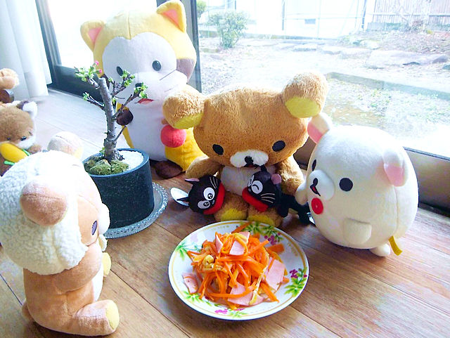 ニンジンさんを千切りみたいな感じにして油揚げさんとハムさんでジュージューさん