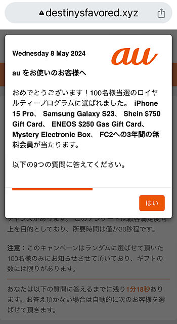 朝起きて、布団の中で携帯電話を触ってたら突然出現したこのポップアップ。