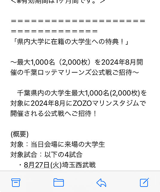 対象:当日会場に来場の大学生 対象試合:以下の4試合 ・8月27日(火)埼玉西武戦 ・8月28日(水)埼玉西武戦 ・8月29日(木)埼玉西武戦 ・8月30日(金)福岡ソフトバンク戦 招待席:内野指定席(フロア4) 抽選当たったら行く 当日会える女性居るのかな