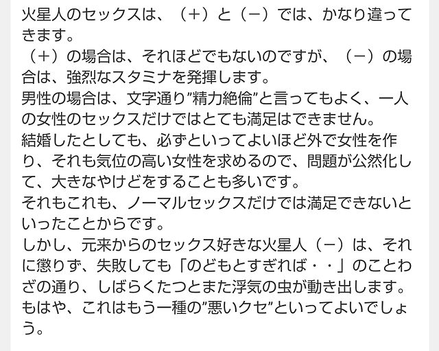 占いとか好きそうではない、婚外恋人親友からのメッセージで、細木先生の占いで、私が火星人マイナス彼女天王星マイナス体の相性が良いとのこと。彼女自身も信じてる方じゃ無いみたいだが、今のセックスの相性の良さに納得のようです。