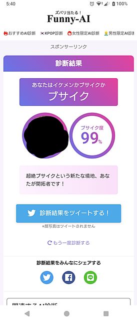 以前日記で書いてた顔面偏差値診断サイトで、「イケメンかブサイクか」を診断してくれるページもあったのでやってみましたw 顔面偏差値だと59というフツメン扱いされたサイトの違うページです 結果は画像の通り……ブサイク度99%www こんなん滅多にお目にかからないでしょwww あ、ちなみに変顔とかもしてないです。普通に以前から使用してる画像をそのまま使い回してます 表示されてる顔だけで判断したら、フットボールアワーの岩尾みたいなんだよなあ……ブサイクやんw