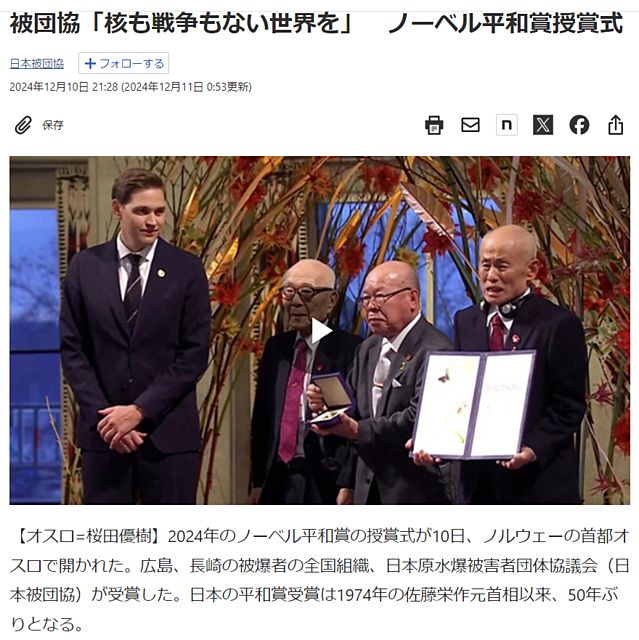 日本被団協が結成されたのは1954年です。つまり、結成以来70年間、同じ主張を繰り返した来た団体に、昨年突然この賞が贈られた訳です。