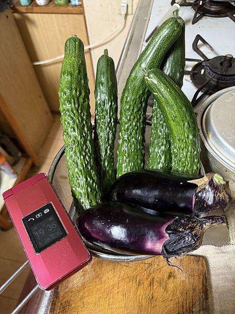写真は本日の収穫物。ナスもきゅうりと同じ3本植え付けていて、収穫が始まりました。もう少し株が成長したら収量が増えるんでしょうね。きゅうりはたぶん今が最盛期、今日は少し大き過ぎになった個体もありました。写真のいちばん小さく見える個体くらいで収穫するのが、いちばん味・食味がいいんだと思います。明日からは気をつけます。なにせ一日でぐんと大きくなるそう、「野菜の時間」で先週言っていました。今年はできるだけつるの処理を助けたことと、株元の雑草を少なくして見通しを良くしたことで見逃してオバケになることを避けられていることが昨年までとの違いかな。つる系野菜はそういう手間を惜しむとうまくないですね。