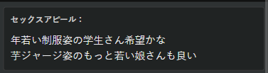 いや、もう、、、言っちゃ悪いけど犯罪者予備軍じゃん… せめて、制服プレイしたい、くらいにしておこうよwww こういうところにそういう年齢層が普通にいたら、法権力によってサービスも潰されると思うよwww