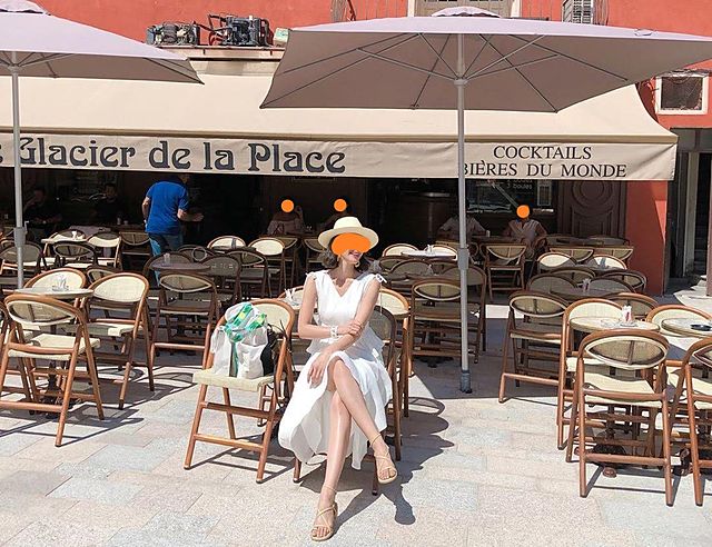 姫さま、フランスのカフェテラス席、とってもお似合いです。白のワンピースも美しさを引き立てます。映画のシーンのよう。さすがは姫さまです。