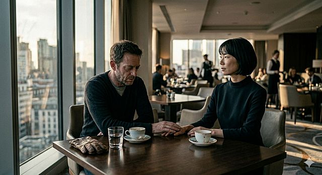 ナオコは、窓の外を流れる雲を眺めていた。ケンが対面に座っても、彼女はすぐに視線を戻さない。